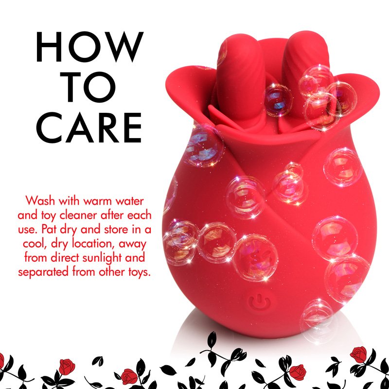 A new kind of blossom, this rose massages your most sensitive of places with two, textured nubs that rub it back and forth! The soft petals of this premium, phthalate-free silicone rose gently brush against your lips as you receive a sensual massage from these little fingers. Enjoy 3 speeds and 7 patterns of vibration and massage that rumbles from the palm of your hand directly into your erogenous zone below. Take it in the shower or bathtub, too! It is rated as IPX7 waterproof so it can be submerged underwater for up to 30 minutes! Recharge after use with the USB cable provided. After playing with this small, discreet, travel-friendly toy, immediately wash it with mild soap and warm water. Spray it with a toy cleaner and pat dry before storing in a cool, dark place.