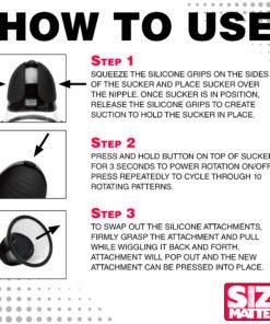 Squeeze the silicone grips on the sides of the sucker and place the sucker over the nipple. Once the sucker is in position, release the silicone grips to create suction to hold the sucker in place. Press and hold the button on top of the sucker for 3 seconds to power rotation on/off. Press repeatedly to cycle through 10 rotating patterns. To swap out the silicone attachments, firmly grasp the attachment and pull while wiggling it back and forth. Attachment will pop out and the new attachment can be pressed into place.