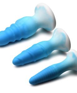 This set of three plugs gives you the best in variety of size and texture! With three graduated sizes of small, medium and large, you can train your derriere to take bigger and wider toys! Additionally, you can have fun doing it and explore more sensation by enjoying the variety of textures offered in this set! Each plug is firm and flexible for your comfort and enjoyment! The small plug has a ribbed texture. The medium plug has a corkscrew line spiraling around the shaft. Finally, the third and largest has a larger head and dips along the shaft that end in a large, round bottom. These dips allow for your sphincter to experience stretching and contracting a few times with every insertion! After you get used to it, you'll love the way it feels!
