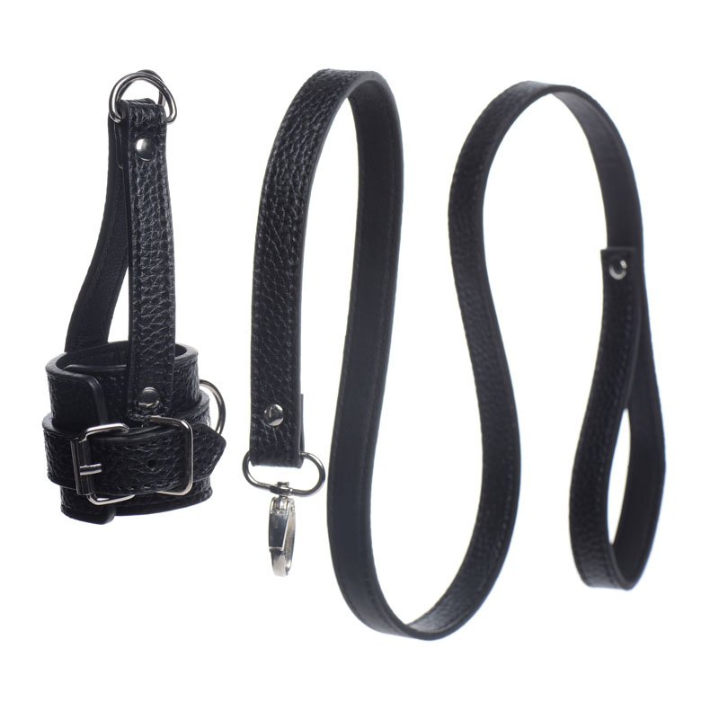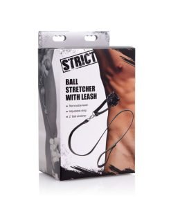 Take your pet for a walk with this humiliating ball-stretcher and leash set! The adjustable stretcher will wrap around his scrotum and tug down, creating a unique sensation that will keep him on edge! Attach the leash to the D-ring on the front or on the straps at the bottom, to pull your plaything around by his balls! You can also use the D-rings to connect weights so that your slave is further tormented.