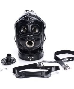 Create a customized sensory experience for your plaything! How much will you deprive them of? This hood has padded ears to take away your partners ability to hear, so that they will not be able to hear the swish of the flogger or the flick of the crop before you hit them. While there are three holes for their eyes and mouth, a blindfold allows you to take away their sight, so that your slave will be surprised by every touch and tickle. A penis-shaped gag even allows you to stuff their mouth so that every sound your partner makes is muffled and they cannot beg for more! Both accessories adjust and have locking buckles. The collar, which has 3 D-rings for attaching other BDSM accessories, also adjusts with a locking buckle. Tighten the back laces to fully confine your pet in the versatile hood, and then enjoy having your way with them!