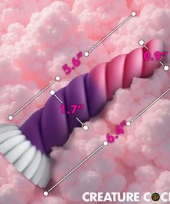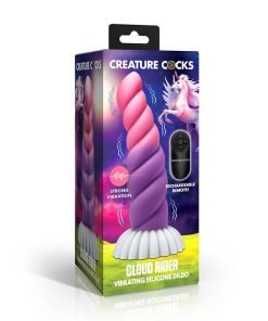 • Elevate your fantasy life with the Cloud Rider Unicorn Silicone Dildo! Shaped like a magical unicorn horn and featuring colors of pink, purple, and white, this vibrating dildo has a small, round tip for effortless insertion. Its smooth, graduated bumps provide delightful sensations as you go deeper. Control 3 speeds and 7 vibration patterns using the rechargeable remote for tailored pleasure. The wide suction-cup base allows for hands-free use and compatibility with most strapon harnesses. Made from premium, body-safe silicone and rated IPX7 waterproof, this toy can be used in the shower or underwater. Always pair with water-based lubricants!