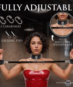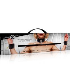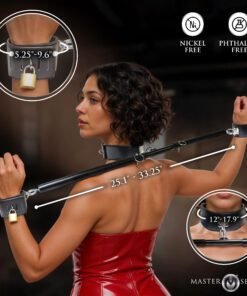 Lock them down and take everything. The Dominion Bar connects a stainless steel spreader bar to two lockable vegan leather wrist cuffs and a matching collar, creating a rigid restraint system that holds your partner exactly where you put them. Use the bar across the front for face-to-face control or flip it behind the neck to pin their arms back and leave them completely exposed. Every connection locks with included padlocks so there is no getting free without your say. The bar adjusts from 25.1" to 33.25", the collar fits 12" to 17.9", and the cuffs range from 5.25" to 9.6", making this a one-size-dominates-all system. Three sets of locks and keys, nickel-free hardware, and premium vegan leather construction throughout.