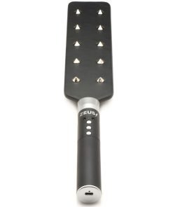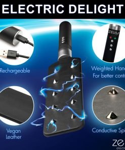 Add some bite to your spanking sessions with this E-stim Spiked Paddle! It has 10 spikes on one side that will bite into your partner's juicy flesh like little teeth. They won't break the skin, but they will leave a memorable sensation. Flip it over to the flat side and rub their behind to cool them down. Then amp up the intensity again by turning on the electrostimulation! Choose between two different intensities and enjoy as they get shocked by the conductive spikes! The paddle is covered in vegan-friendly, vegan leather and the metal is made out of nickel-free, zinc alloy. The e-stim paddle is rechargeable. Simply use the USB cable provided. Keep away from water.
