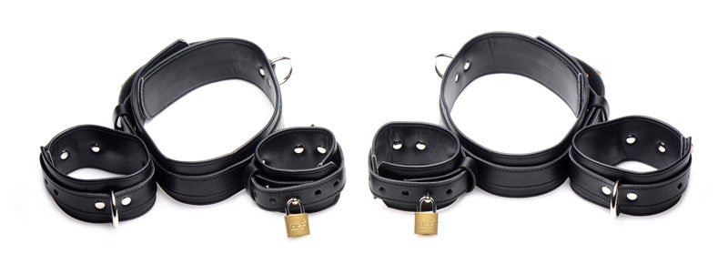 Lock up your partner with the durable locking buckles - this Frog Tie restraint set includes 6 locks and 12 keys for you to restrain your lover! Restrain their ankles to their thighs to force them to their knees, then bind their hands next to have them completely exposed and vulnerable! Combine with other dungeon toys like slappers, floggers, and blindfolds for the ultimate bondage experience.