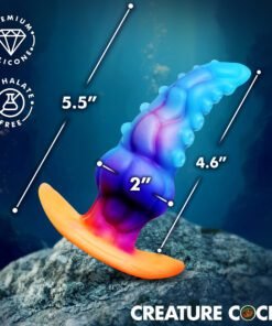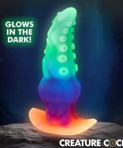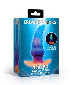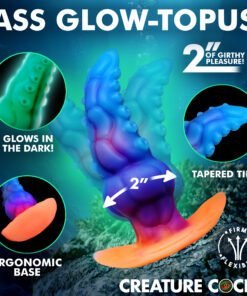 The GLOWTOPUS is a glow-in-the-dark silicone anal plug shaped like a thick tentacle with sculpted ridges, suckers, and alien textures that stimulate on insertion and during extended wear. The tapered tip eases entry before the shaft widens to a full 2 inches at its widest point. The ergonomic flared base sits securely and prevents over-insertion. Premium phthalate-free silicone delivers the right balance of firm and flexible for a filling, satisfying stretch. Expose the plug to sunlight or UV light and the silicone glows in the dark, adding a visual fantasy element to scene play. Compatible exclusively with water-based lubricants.
