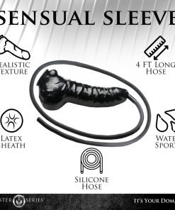Use some lube on your shaft and the latex then stretch it over your rod and get it in place. Once on, check that the hose is secure, and then enjoy! Lay down towels, set out cups or jars for catching fluids from the hose, get a waterproof sheet or use the shower or bathtub to get wet and wild! Use the hose to pour the liquid over yourself or aim it over your favorite water-sports loving partner! To clean after use, rinse with warm water and mild soap, then use a toy cleaner and pat dry.