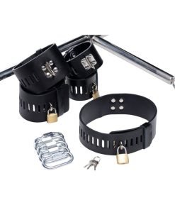 Note: Includes 7 bars to fit together, collar, wrist restraints, ankle restraints, dildo, 5 lock and key sets, and 5 connectors.