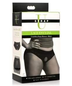 This great alternative to a strapon harness is comfy and compatible with all dildos! Play with a different dynamic with this Crotchless Panty Harness! This harness has a universal O-ring that can fit any strapon dildo. The wide, elastic waistband is comfortable and hugs you above the hips. Designed so that you can both give and receive pleasure during play, it is crotchless and has an open back that exposes your booty, too! This comfortable, easy to play in, supportive panty is made of nylon and is machine washable on a cold cycle. It can also be hand washed in mild soap and cool water.