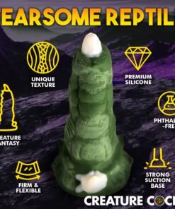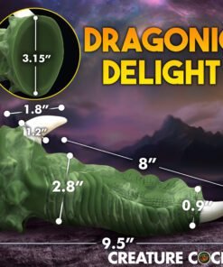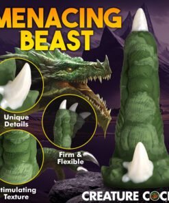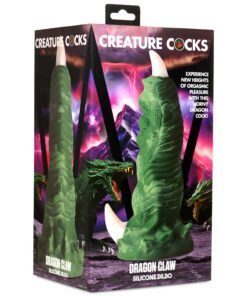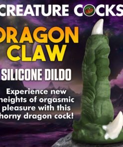 The dragon reaches for you, slides inside, and its green finger tipped with a tapered, white talon rocks your world! Every texture makes your eyes roll back in your head! The ribbed scales and the bumpy lizard skin combine for a mythical and epic experience! Made out of premium, flexible, phthalate-free silicone, this dong is body-safe and best used with water-based lubricants only. Enjoy hands-free rides due to the strong suction cup base! Invite a partner to indulge in kinky cosplay or fantasy roleplay and use their favorite harness to transform this dong into a strap-on! Afterward, make sure to wash it with warm water and mild soap, then spray it with a toy cleaner and air-dry. Keep out of direct sunlight and heat.