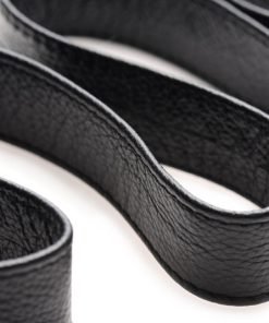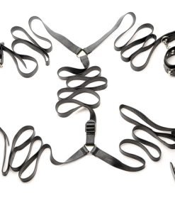 Better than your average bed restraint kit, this luxurious leather set with heavy-duty hardware captures the elegant atmosphere that you crave during your naughtiest private moments. Adjustable to fit any bed size, this system of bondage gear slides under your mattress, while each adjustable strap spreads out and emerges on the sides or head and foot of the bed, depending on how you like to play. Swivel hook clips connect to the D-rings of the sophisticated, leather wrist and ankle cuffs, allowing you to confine your lover in a variety of positions while you have your way with their helpless body!