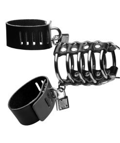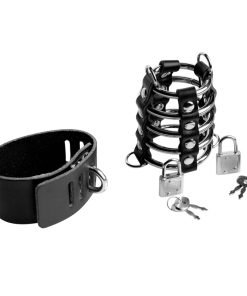 Revel in a unique and customized chastity experience! Your owner will love keeping your penis locked away, unable to form an erection. If you start to get hard, the rings will dig into your cock painfully! Two adjustable leather straps lock onto the cage, keeping you fully confined and unable to escape! One strap goes around your cock and balls, while the other acts as a ball stretcher to wrap around the base of your scrotum! D-rings at the end of the cage allow your Master or Mistress to add weights of other sadistic accessories to amplify your experience!