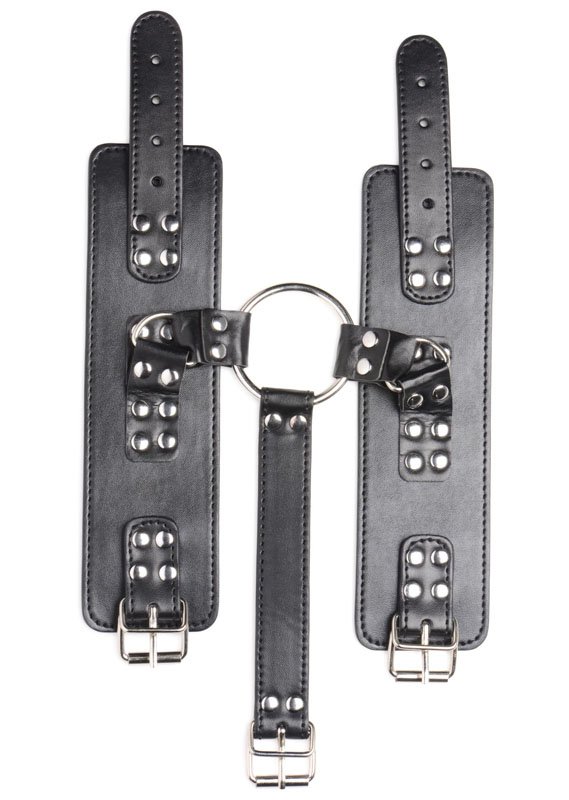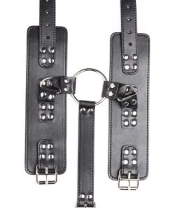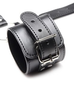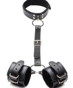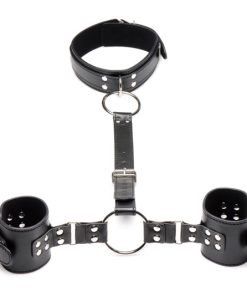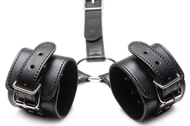 Hook your fingers around the O-rings and tug your lover towards you. Play with attaching the O-rings to different anchor points or place their hands far away from them. Their wrists will be cuffed and restrained, the center strap attached to their collared neck. Keep the center strap short to keep their hands just out of reach of their genitals so they can t play with themselves, and enjoy teasing and toying with them. Limit their movement even more by bringing the strap around to the back and placing their restrained wrists behind their back.