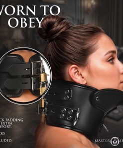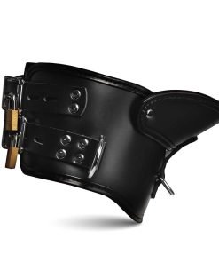 Transform your dominance game with the Rigid Locking Posture Collar with Chin Brace. This collar comes with adjustable and lockable straps to maintain the perfect fit. A thin layer of padding ensures comfort, making it suitable for prolonged wear. The chin support keeps the head in an obedient position. With 3 D-rings strategically placed at the front and sides, it provides multiple options for attaching your favorite kink accessories. Constructed from vegan leather, it mimics the real thing and is a breeze to clean. Elevate your play and maintain control with this robust and stylish collar.