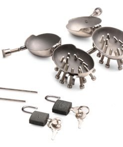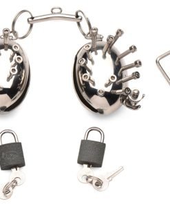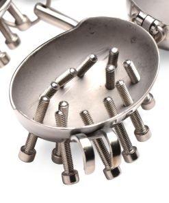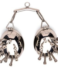 Test your masochistic edges with these scrotum CBT egg shells with spikes! The eggs are made entirely of stainless steel so they are durable, long-lasting and easy to sanitize. The metal is also sensitive to temperature so you can heat or cool them for extra sensation! Each egg fits around the testicles and there is a spacer of 0.36 inch width where the scrotal sac goes. The testicles go inside the eggs and then the device closes around the testes using a hinged pin. To lock the testes in place, close the hinge and begin tightening the nut down on the screw. This should reveal a small hole in the pin where you can place one of the two included locks on the pin and lock the egg into place. To add pressure and pain, tighten any of the screws that surround the eggs. To add an even more sadistic twist, add a weight to the small, metal bar that connects the two eggs; attach the weight to the small O-ring at the center of the bar. After use, wash with warm water and soap and spray with a toy cleaner. For serious sanitation, these items can be placed in a dishwasher or soaked in a cleaning solution.
