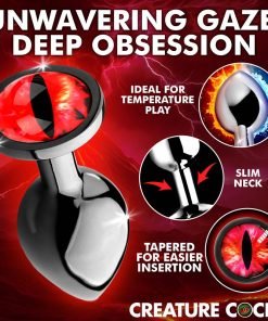 Step into another world with the Sinister Eye Metal Butt Plug! This fantasy-themed metal plug showcases a mesmerizing glass eye that peers out for a thrilling visual. Made from nickel-free metal, it suits sensitive skin and is lubricant-friendly. With a safety-first design that includes a small neck, flanged base, and tapered tip, it ensures comfort and ease of use. Spice things up by heating or cooling the plug with water to add an exciting temperature sensation to your intimate moments!