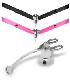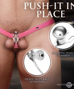 The Master Series Sissy Vice Push-In Chastity Cage is designed to create a feminized frontal presentation by enclosing the penis within a smooth metal chamber and positioning the testicles with a structured ball separator. When secured, the device reduces the outward profile and creates a flatter, vulva-like silhouette. The elastic harness holds everything in place and includes both black and pink strap options for varied styling. Constructed with nickel-free metal and phthalate-free materials, this piece is intended for customers exploring chastity and feminization-focused dynamics.