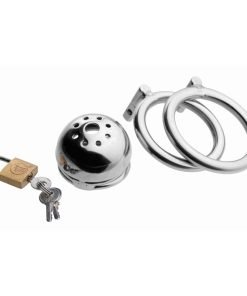 Lock up his dick in solitary confinement! His cock will not be getting any attention while it is trapped in this intensely constricting chastity device. Yank his cock and balls through one of the two base rings, sized differently to fit your submissive the way you like it. Lock the shaft portion of the cage in place, squeezing his flaccid cock for the ultimate incarceration. Now he is completely at your mercy, unable to find release unless you allow him to. This sturdy stainless steel cage can be worn for as long as you desire, with a faucet feature that allows him to urinate. His cock belongs to you… and you hold the key!
