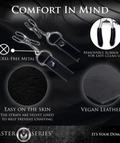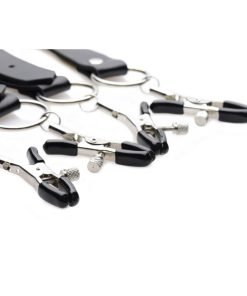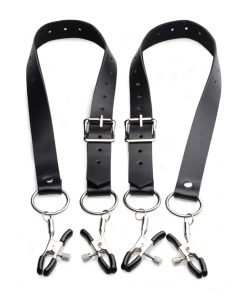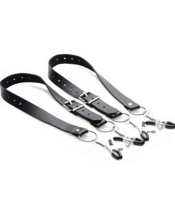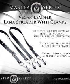 Turn up the intensity of your kinkiest scenes with these unique straps, designed to wrap around your thighs, clamp onto your labia, and spread them open! Perfect for humiliation play, gynecological roleplay, or whatever wicked fantasies you want to bring to life, this unique set keeps your partners genitals ultra sensitive and helplessly exposed like never before. The straps are lined on the interior with a velvety softness and have buckles to adjust the fit around your thighs. The rubber-tipped clamps have thumb screws that adjust their pressure. Get creative with your BDSM scenarios!