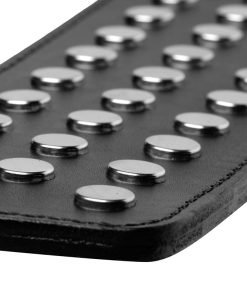 This 16.5 inches leather paddle is similar in style to our fraternity paddle but with on little twist. It has 30 steel studs on the impact side. The studs add weight and a more intense feeling that our other leather paddles.