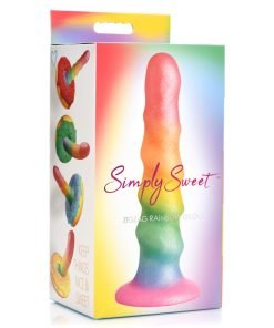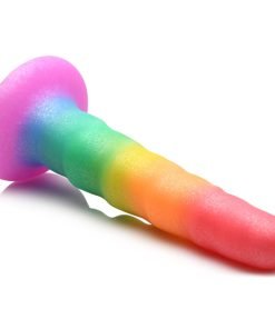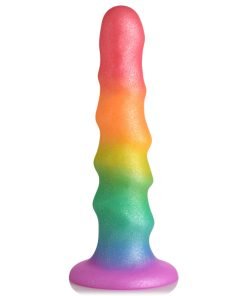 Combine fantasy and sexy play with this shimmering, rainbow colored dildo. The zigzag design of this dildo gives you alternating bumps that stimulate and massage you from within with each thrust, stroke and penetration! Made to be soft and flexible, it is easy to use for both beginners and advanced users alike. Let it bend to your will and fill you up! Made out of quality silicone so it's phthalate-free, latex-free, non-porous and hypoallergenic. Use it only with water-based lubricants for best results. The wide base makes it compatible with most strapon harnesses so you can indulge in fantasy roleplay and pegging! Or go hands-free and enjoy the strong, suction cup base when you place it on any flat surface! To clean it, simply wash it with warm water and mild soap, then spray it with a toy cleaner and pat dry after rinsing it off. Keep out of direct sunlight and away from extreme heat.